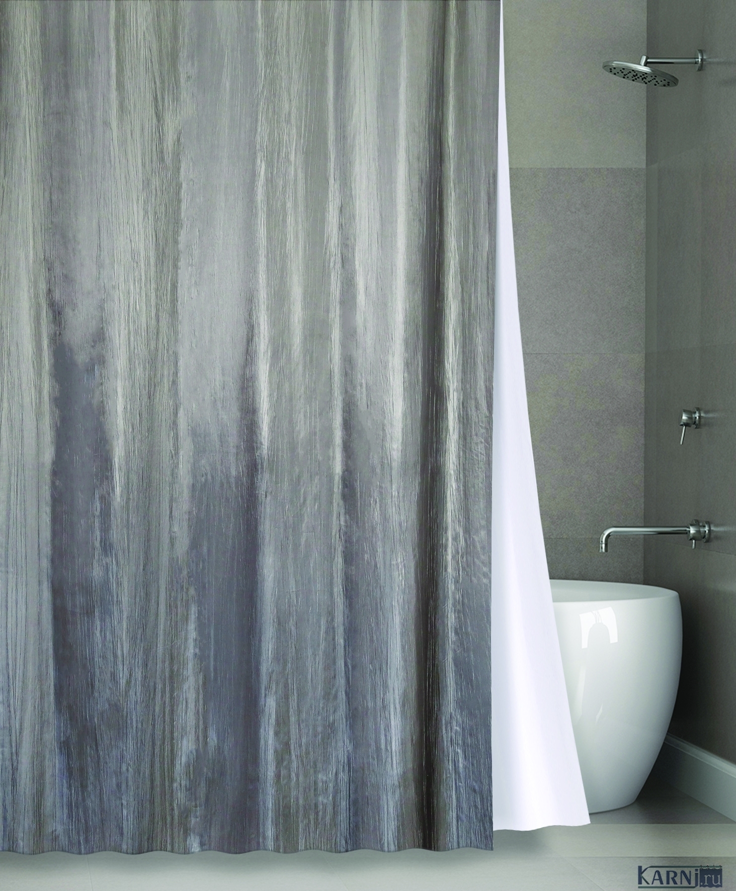 Двухслойная штора для ванны с 12 металлическими люверсами под кольца. Снаружи цветная штора из органзы, внутренняя штора - клеенка ПВХ для защиты от влаги. Цвет: сама штора серая/клеенка белая полупрозрачная.